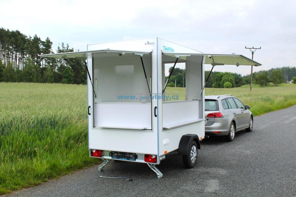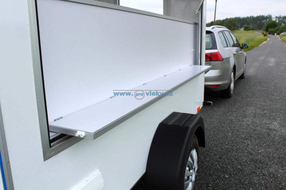 Malý nebrdený predajný stánok s nízkou váhou a kompaktnými rozmermi. V základe už s predajným pultom, PVC a prívodom 230V. Prívesný vozík je možné využiť ako gastro predajňu alebo predajňu.